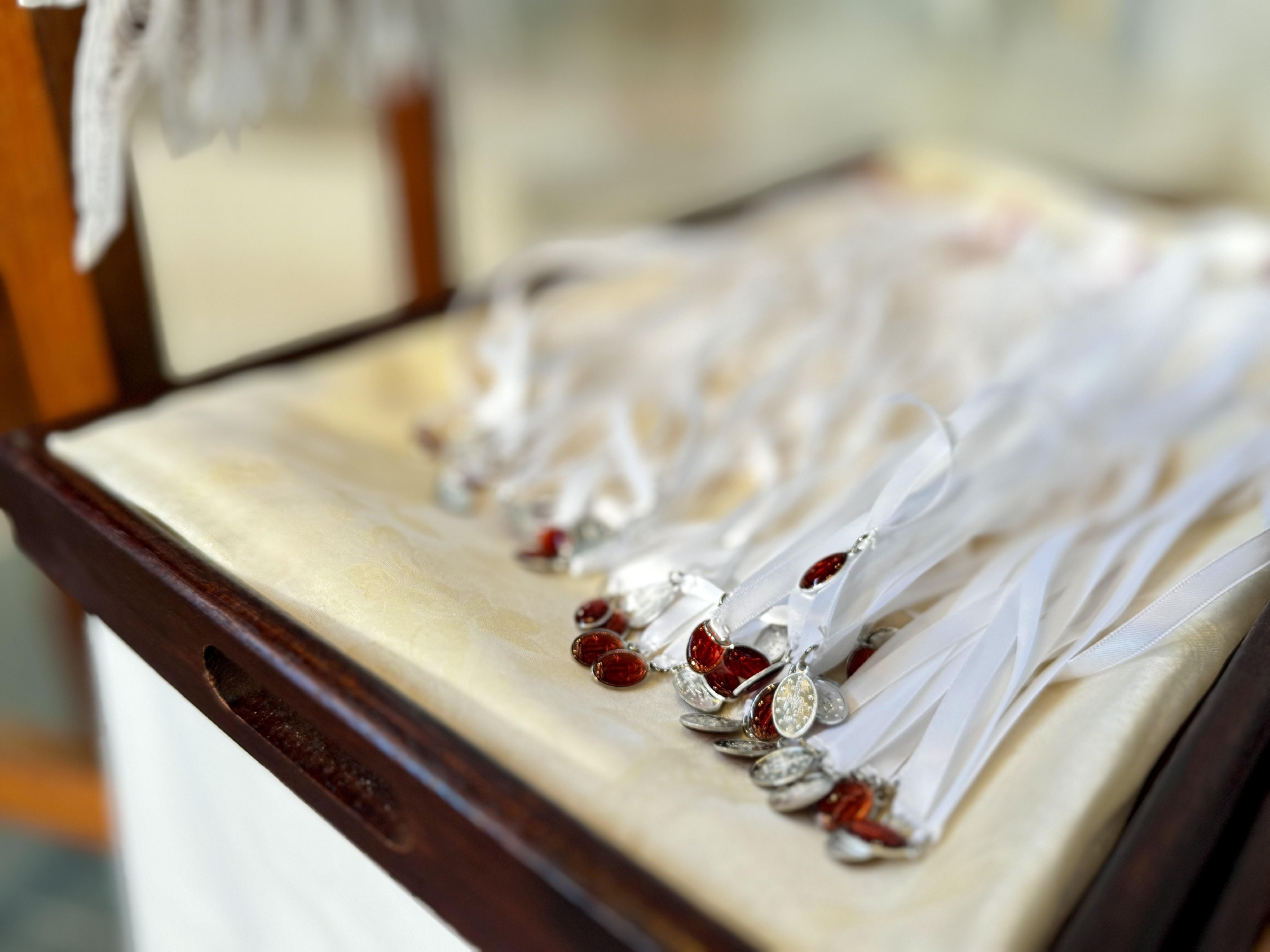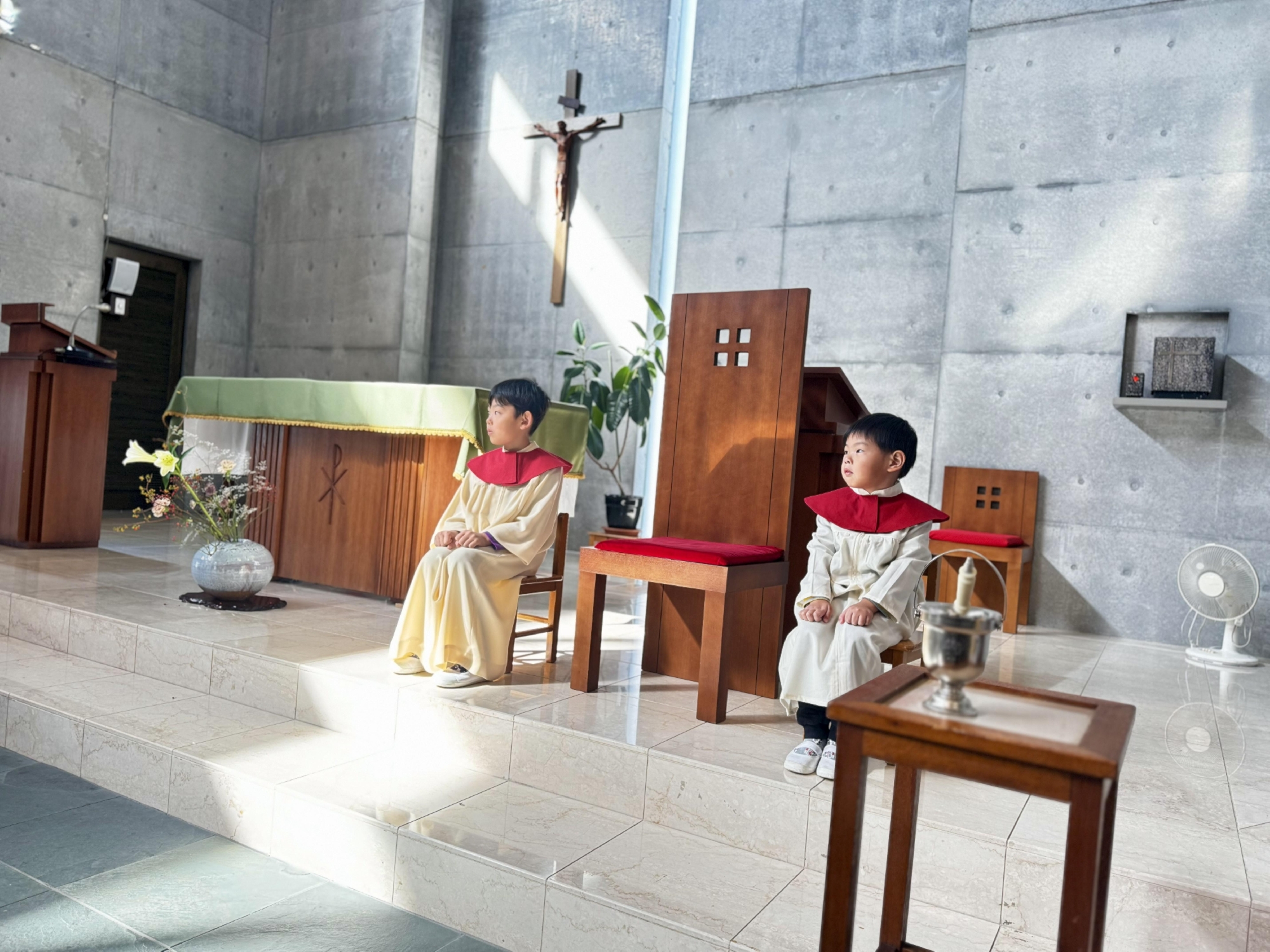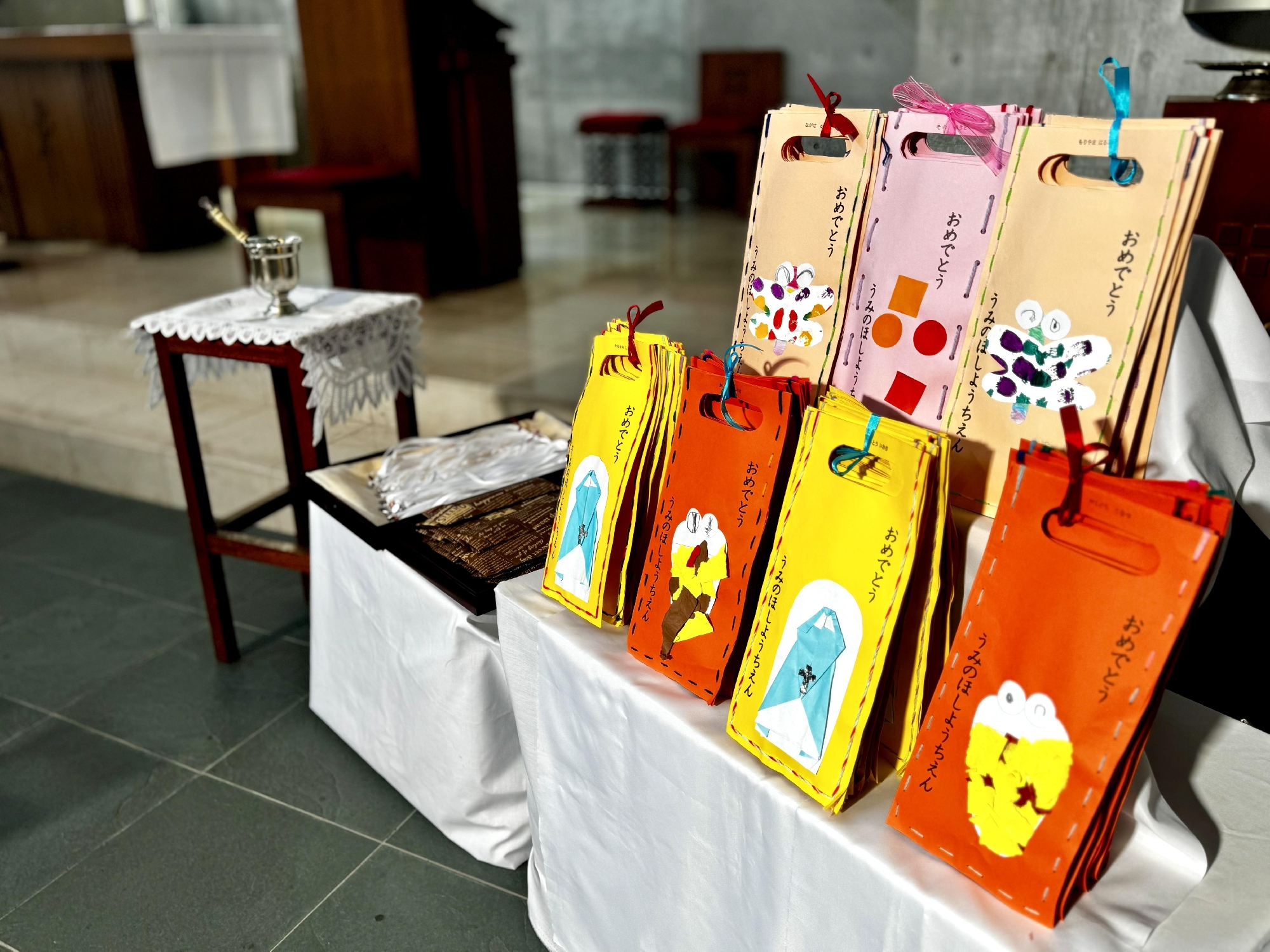 教会で、神父様に祝福をしていただいたり、おメダイや千歳飴をもらったりと